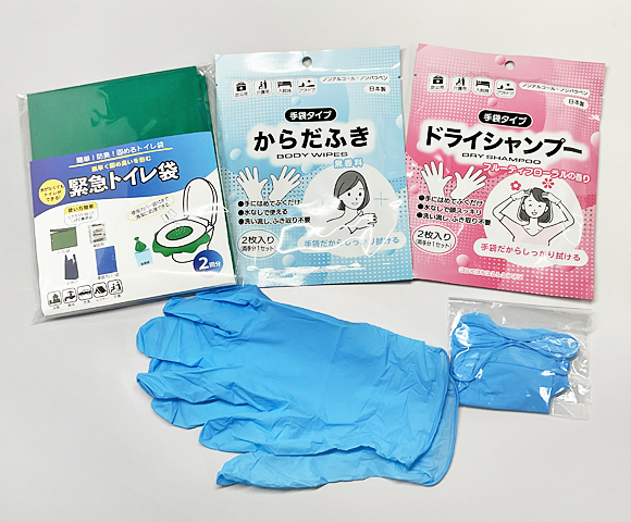 - 緊急トイレ袋2回分・使い捨て手袋2双・手袋型ドライシャンプー2枚・手袋型からだ拭き2枚。