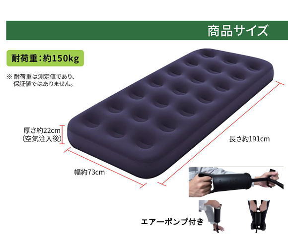 | 仕様 | エアーベッド、専用ポンプ、ホース、補修用パッチ×2枚 |